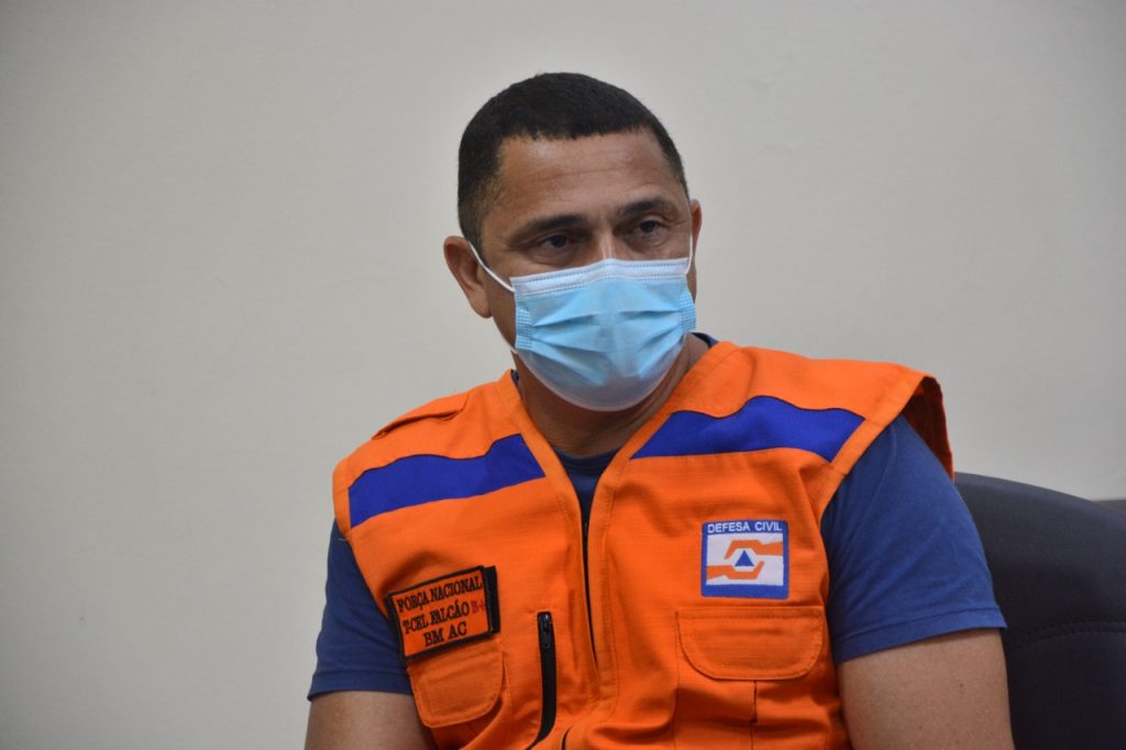 Ten cel Cláudio Falcão diz que o Plano de Contingência está mantido, mesmo com vazante do rio Acre (Foto: Felipe Freire/Assecom)