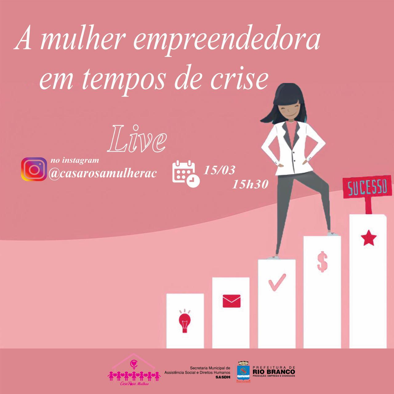 Nesta segunda-feira, 15, a Secretaria Municipal de Assistência Social e Direitos Humanos (SASDH) realiza uma atividade sob coordenação da diretoria de Direitos Humanos. A Live ‘A Mulher Empreendedora em Tempo de Crise’ será apresentada pela gerente do departamento de Políticas para Mulheres, Cristina Maia, às 15h, no Instagram da @casarosamulherc.