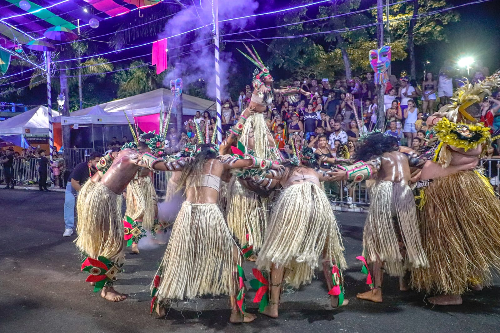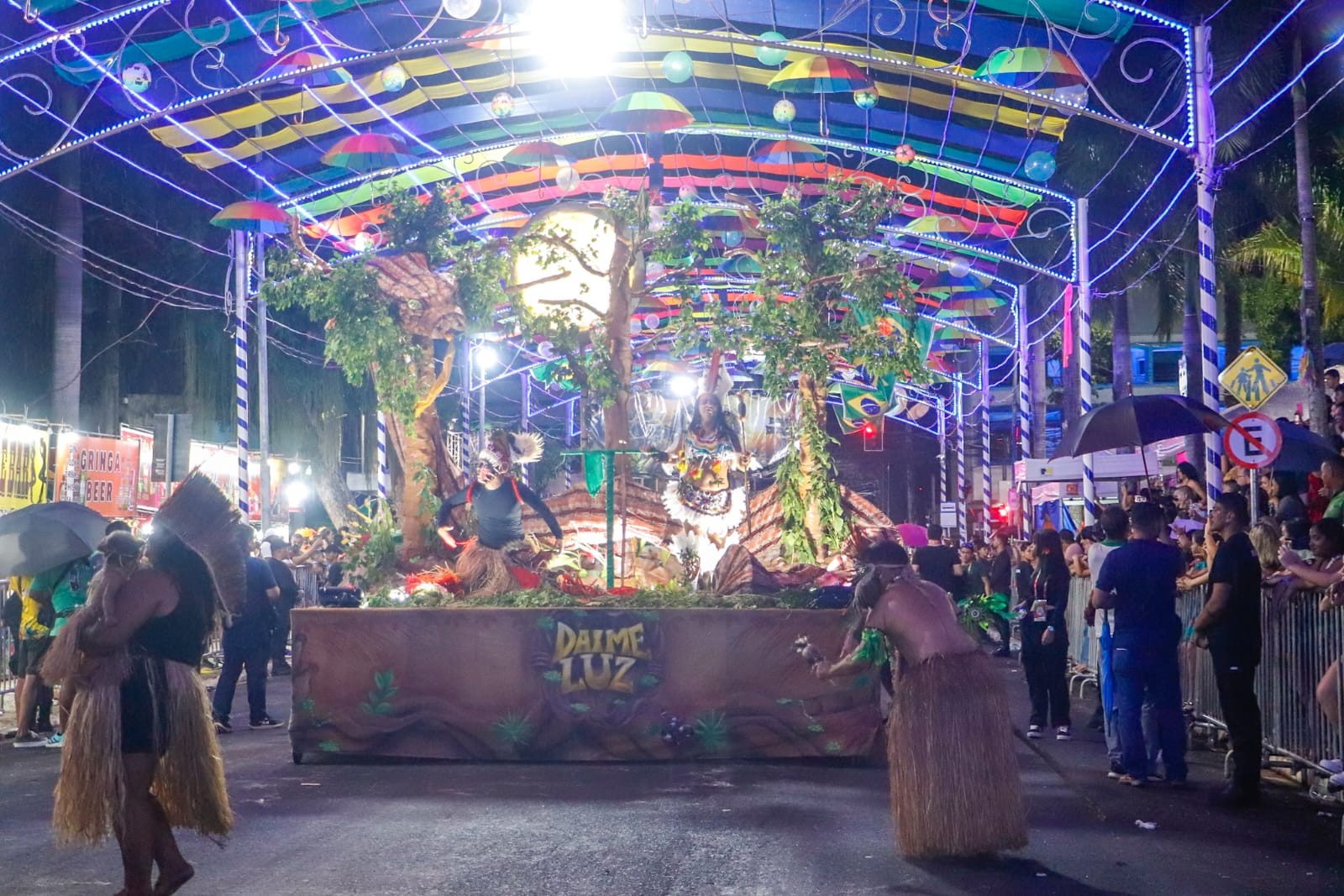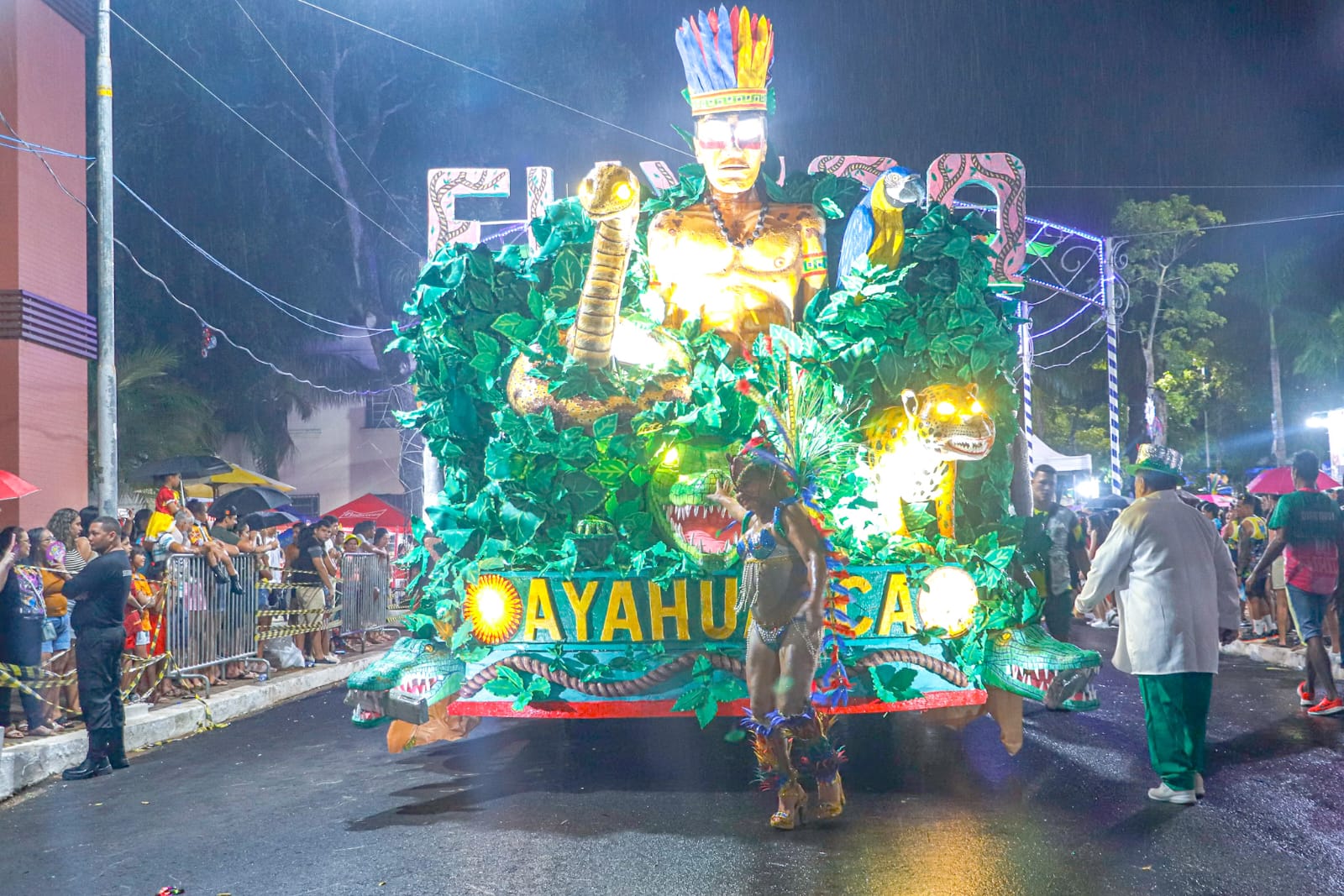 Abrindo a programação da noite, o bloco Unidos do Fuxico levou para a avenida o enredo sobre a ayahuasca e a origem do Santo Daime, destacando a valorização das raízes culturais e dos povos originários da Amazônia. Mesmo sob chuva, cerca de 350 a 400 integrantes participaram do desfile, resultado de meses de pesquisa e preparação.