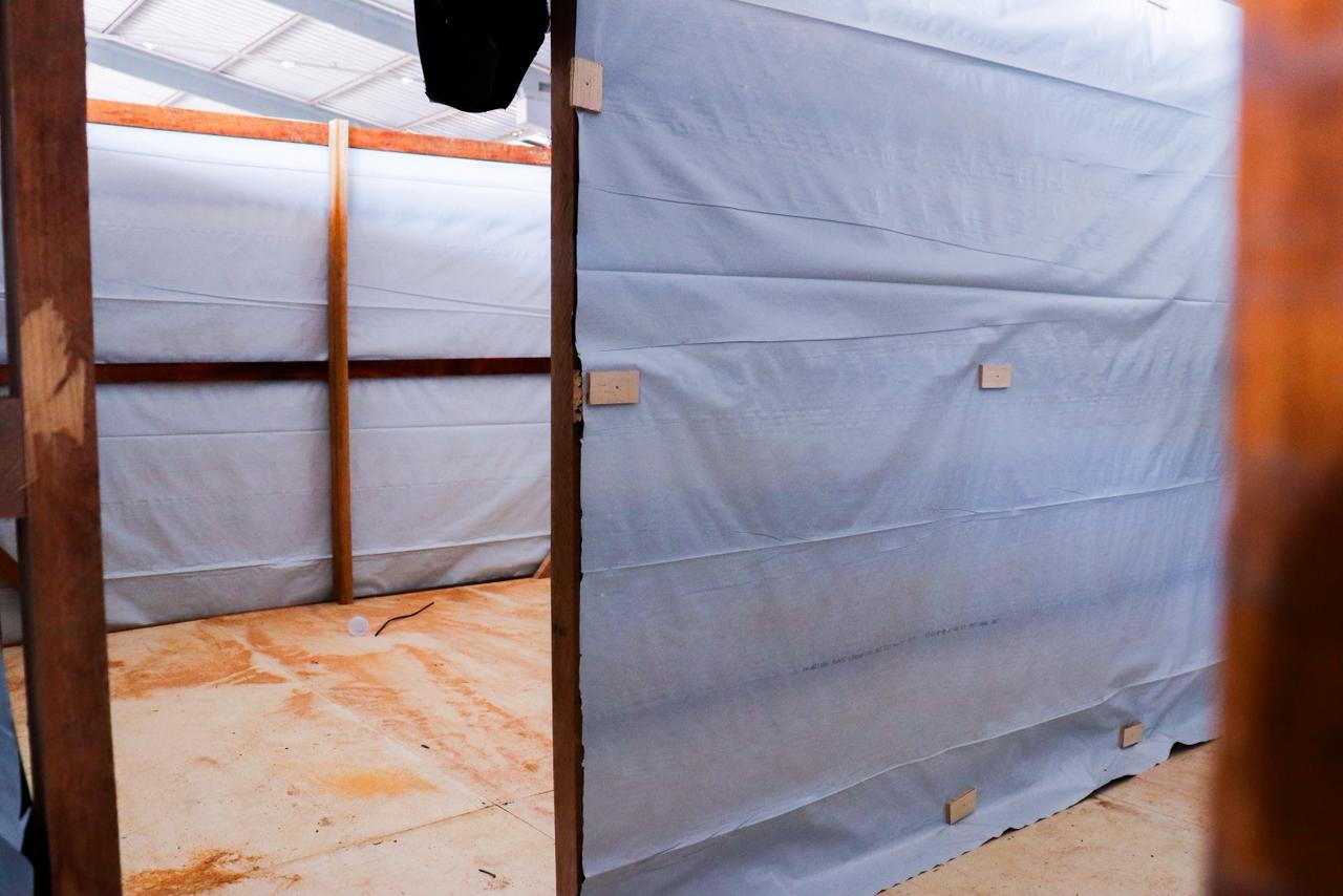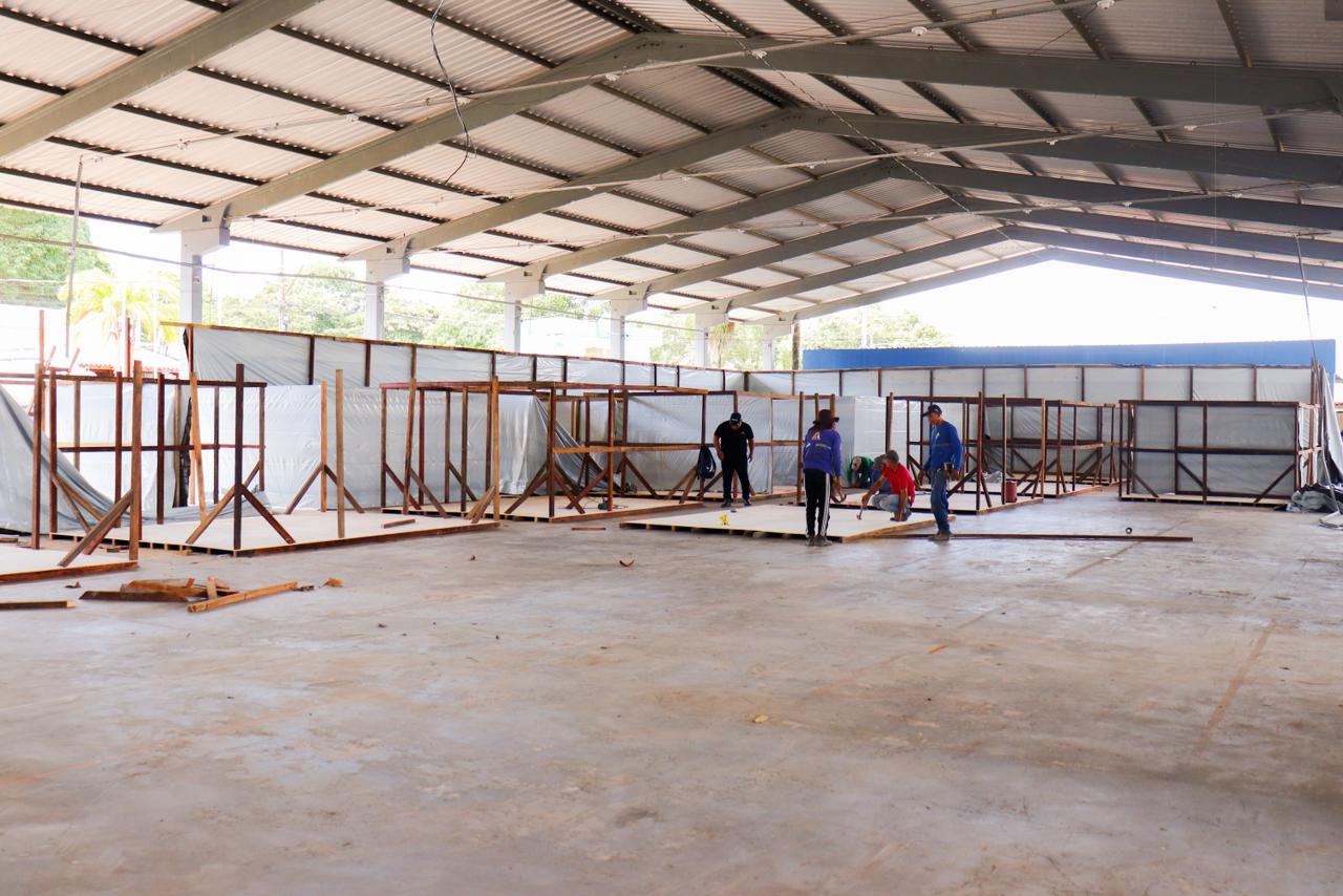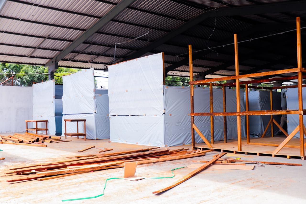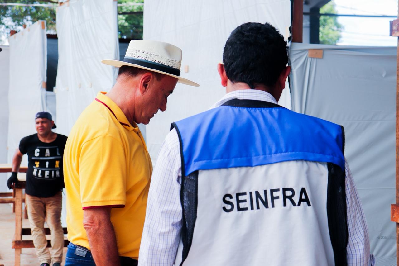 Na manhã desta segunda-feira (29), o prefeito esteve no Parque de Exposições Wildy Viana para acompanhar a construção dos boxes que irão abrigar as famílias. (Foto: Vitória Souza/Secom)