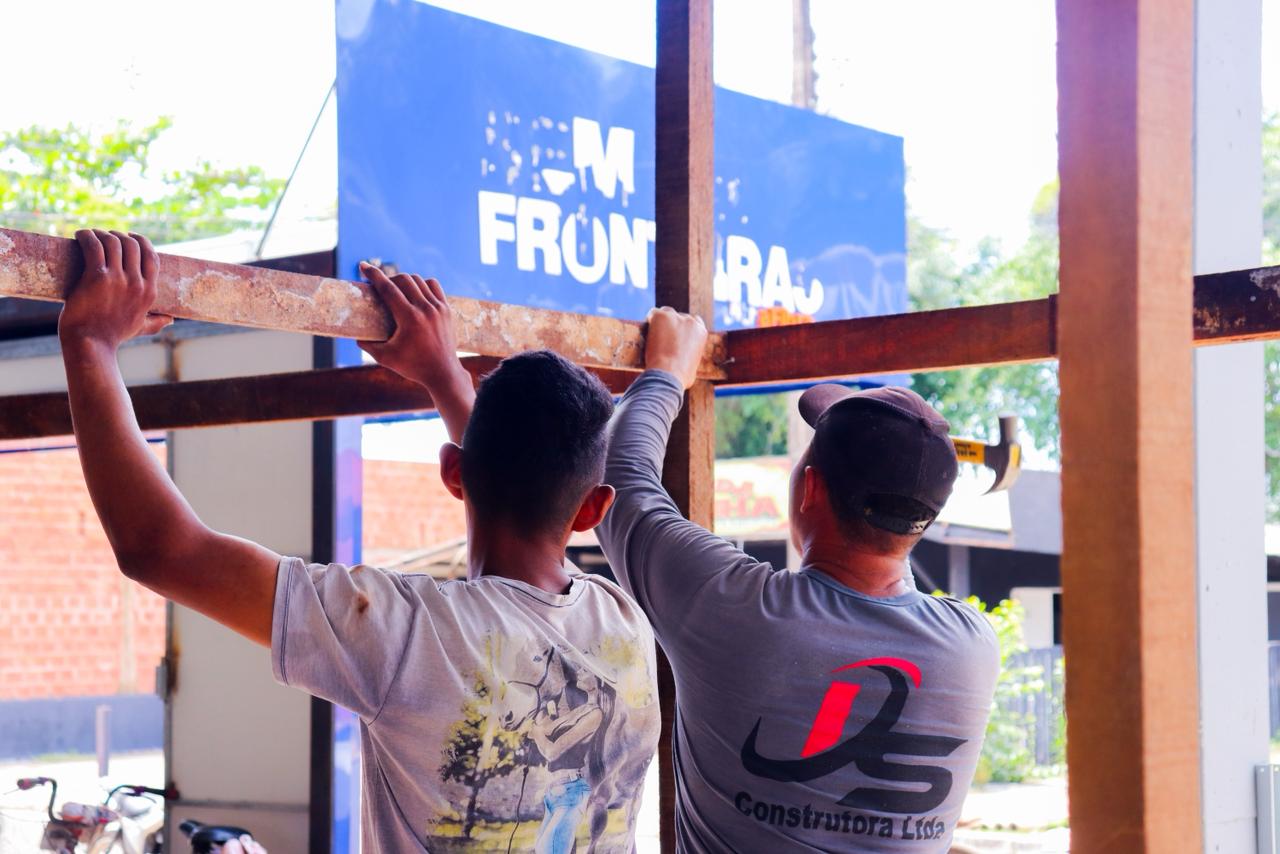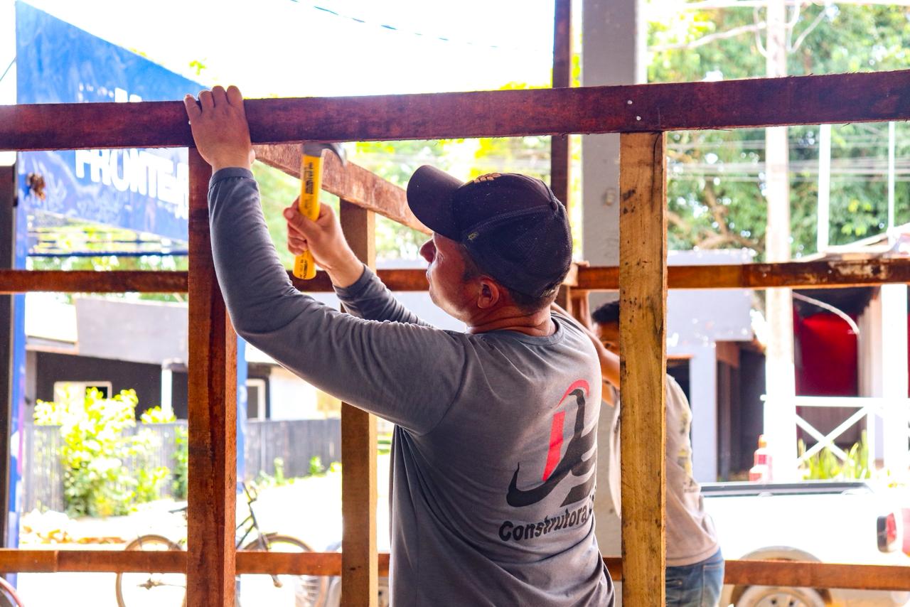 Na manhã desta segunda-feira (29), o prefeito esteve no Parque de Exposições Wildy Viana para acompanhar a construção dos boxes que irão abrigar as famílias retiradas dos bairros afetados pela elevação das águas do manancial.