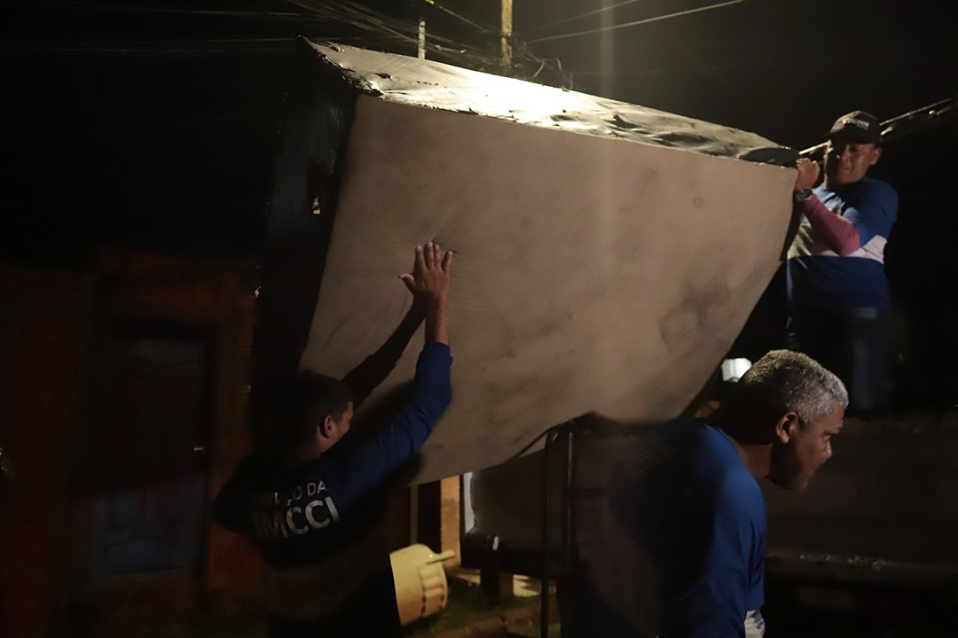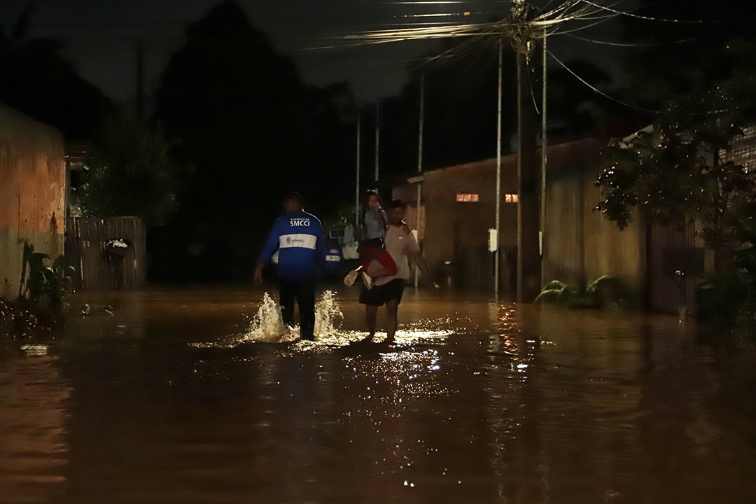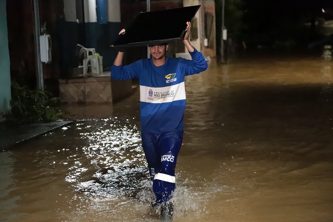 “De forma permanente e constante, desde as primeiras horas em que começou a chuva, iniciamos um monitoramento. Ficamos a madrugada inteira e, pela manhã, começamos a ir aos bairros para verificar como estava se comportando toda a questão hidrográfica aqui de Rio Branco. Constatamos recentemente que tivemos mais de 170 milímetros de chuva. Com isso, houve um grande transtorno para as famílias e agora, ainda durante a noite, seguindo as orientações do prefeito Tião Bocalom, estamos aqui, no bairro da Paz, retirando famílias. Já ativamos abrigos e estamos removendo mais famílias, uma vez que o igarapé Batista continua aumentando paulatinamente”, explicou Cláudio Falcão, coordenador da Defesa Civil Municipal.