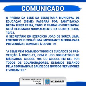 Secretaria de Educação confirma o cancelamento das aulas presenciais do 5° ano 1 de fevereiro de 2021