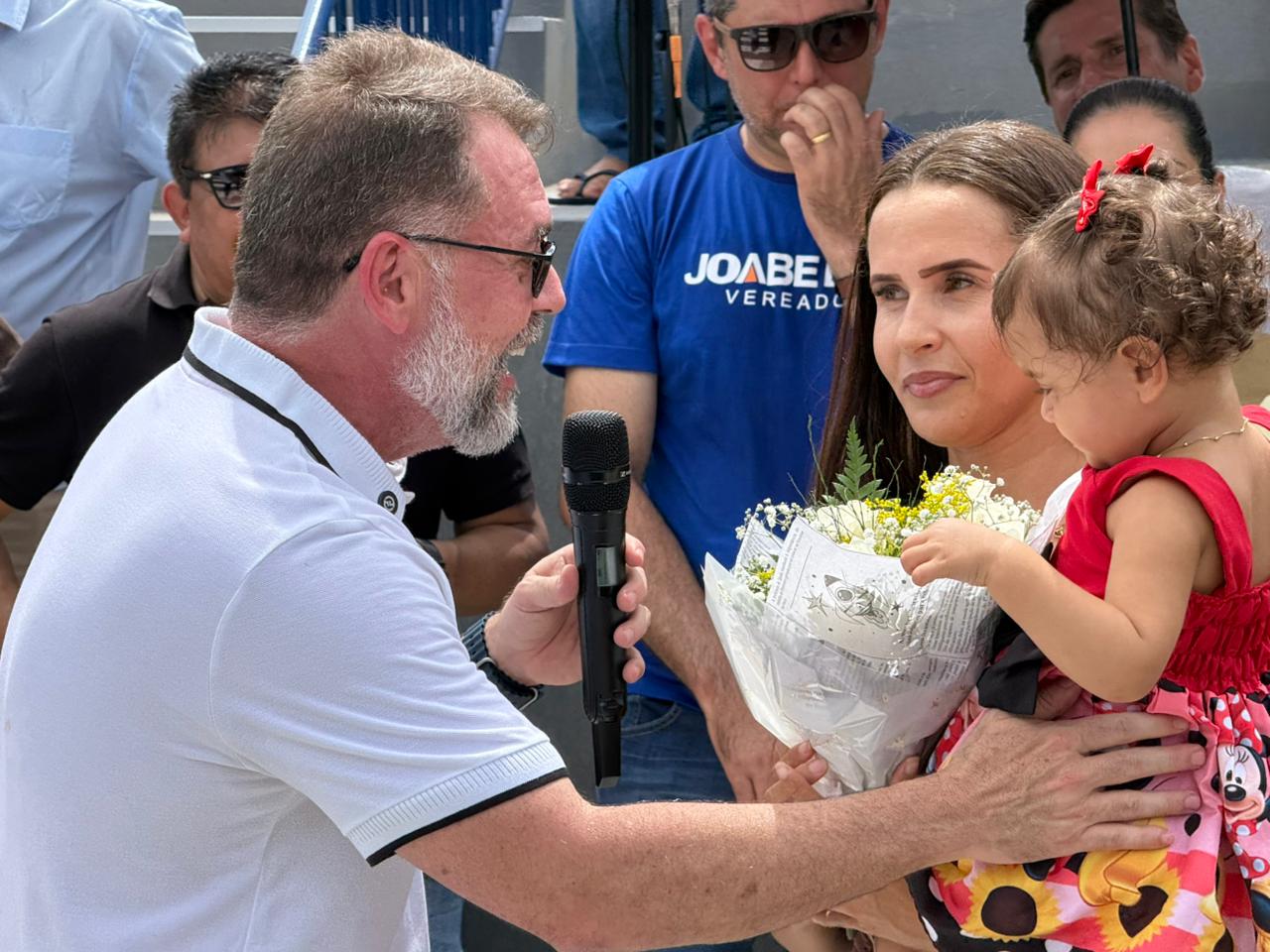 A primeira-dama, Kelen Bocalom, recebeu flores em agradecimento pelos serviços prestados à população, das mãos da esposa do vice-prefeito, Roberta Lins.