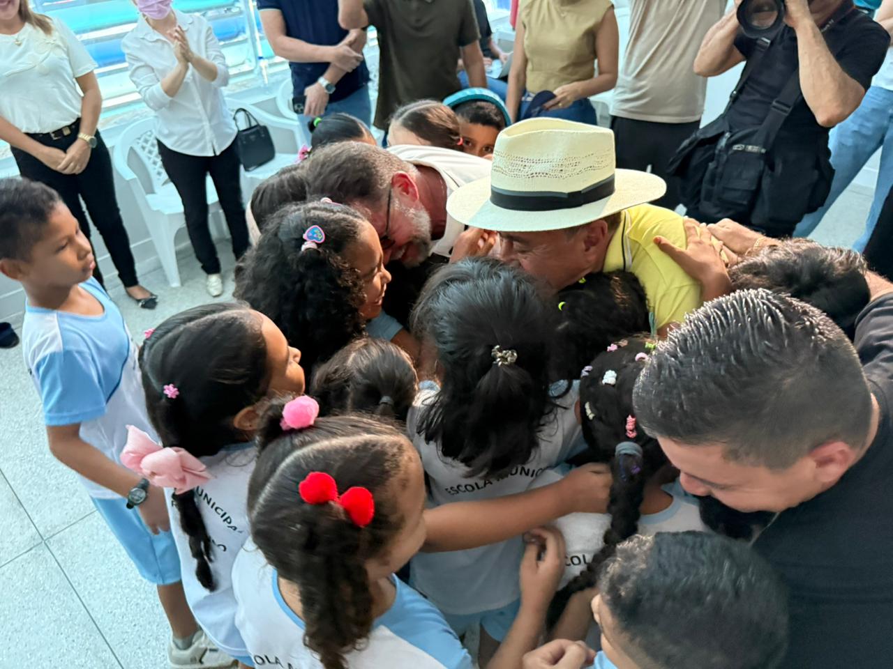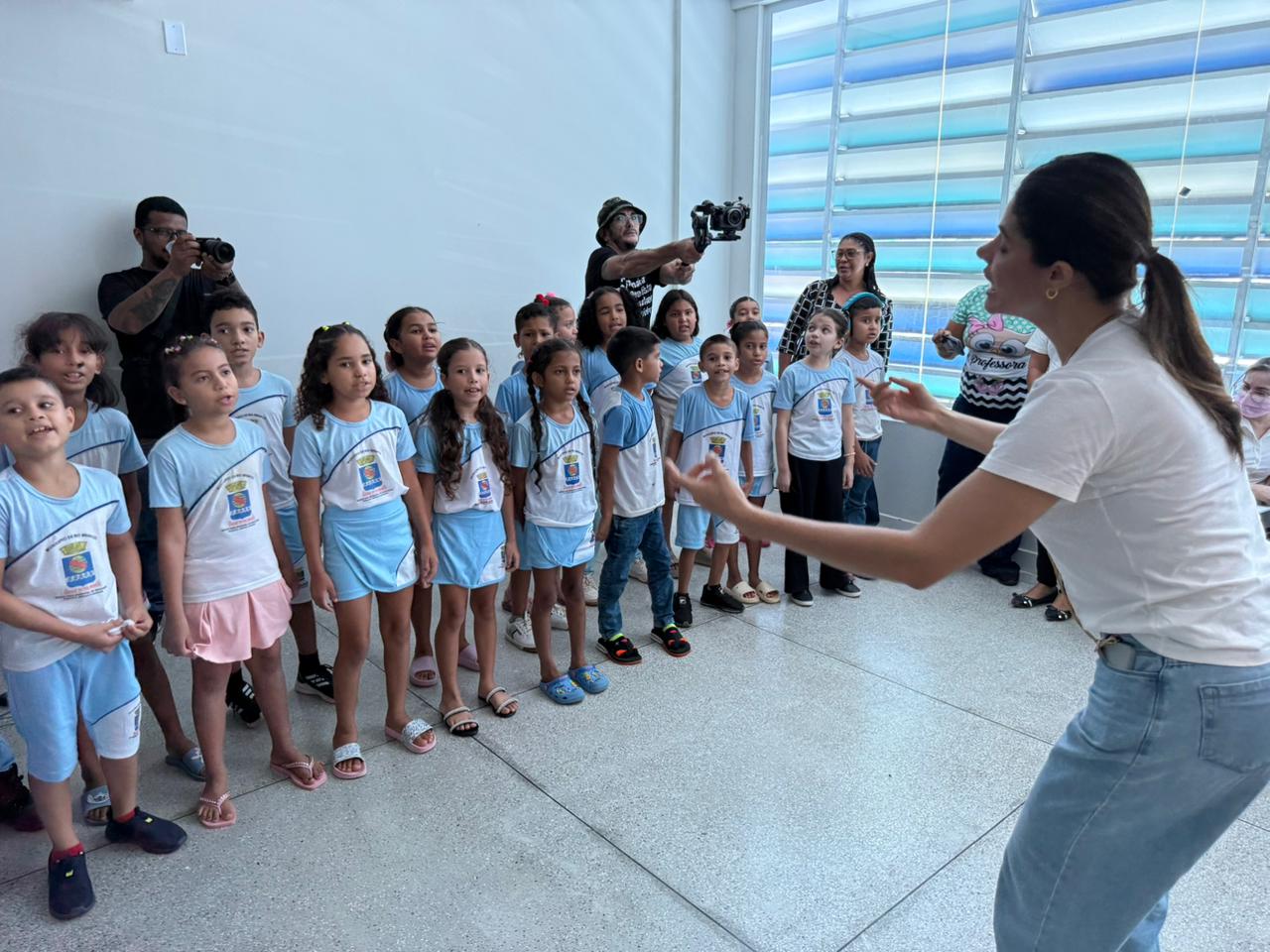 Alunos da Escola Mauricília Santana prestaram uma homenagem musical ao prefeito e ao vice-prefeito, encerrando a solenidade com abraços e celebração. (Foto: Jeferson carvalho/Secom)