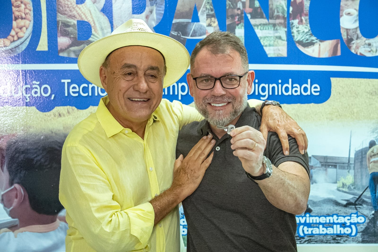 “Eu saio feliz”, afirmou Ex-prefeito de Rio Branco Tião Bocalom, entregando uma chave ao agora prefeito Alysson Bestene, símbolo da trans missão de cargo. (Foto: Anderson Oliveira/Secom).