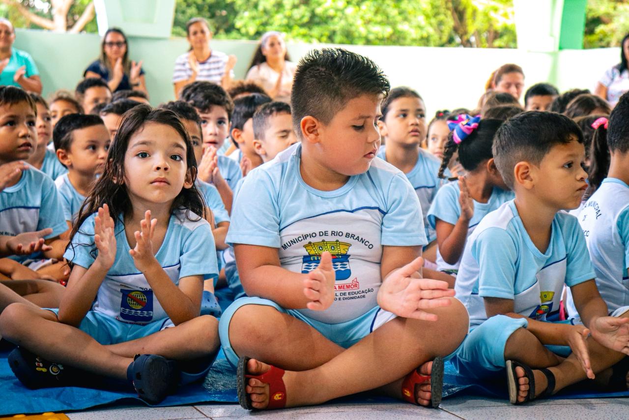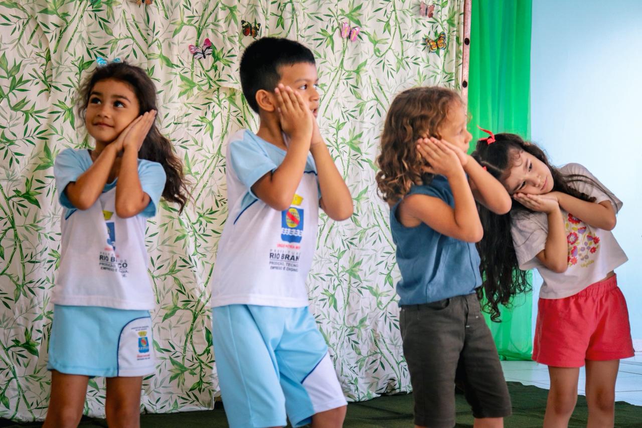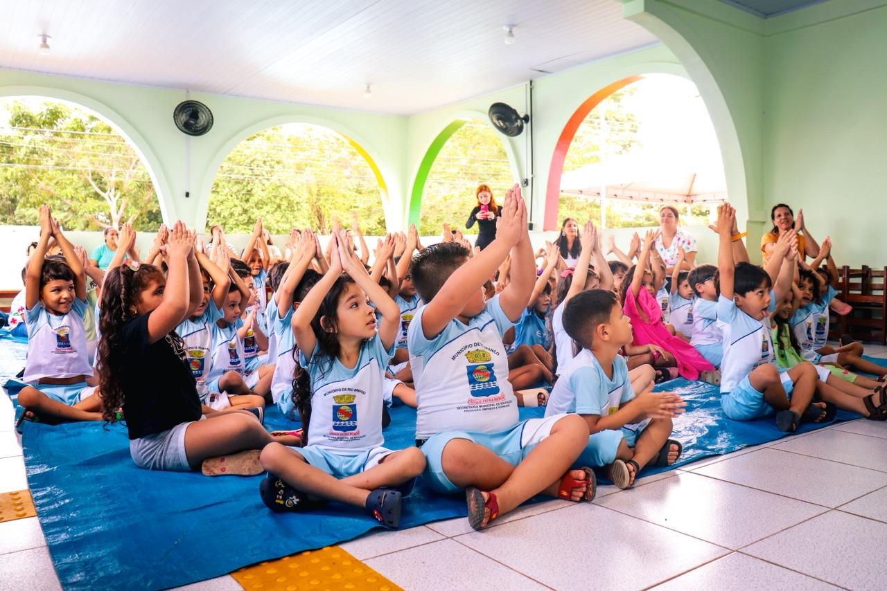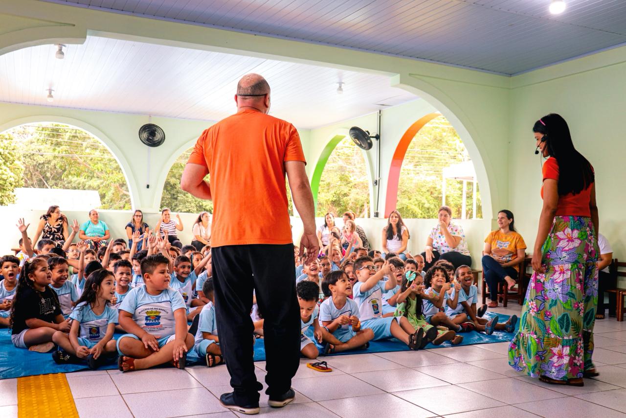A apresentação do grupo Voz e Arte envolveu os alunos em atividades que combinaram música, histórias, brinquedos cantados e brincadeiras tradicionais. (Foto: Vitória Souza/Secom)