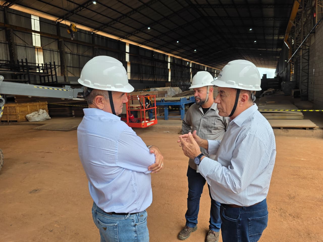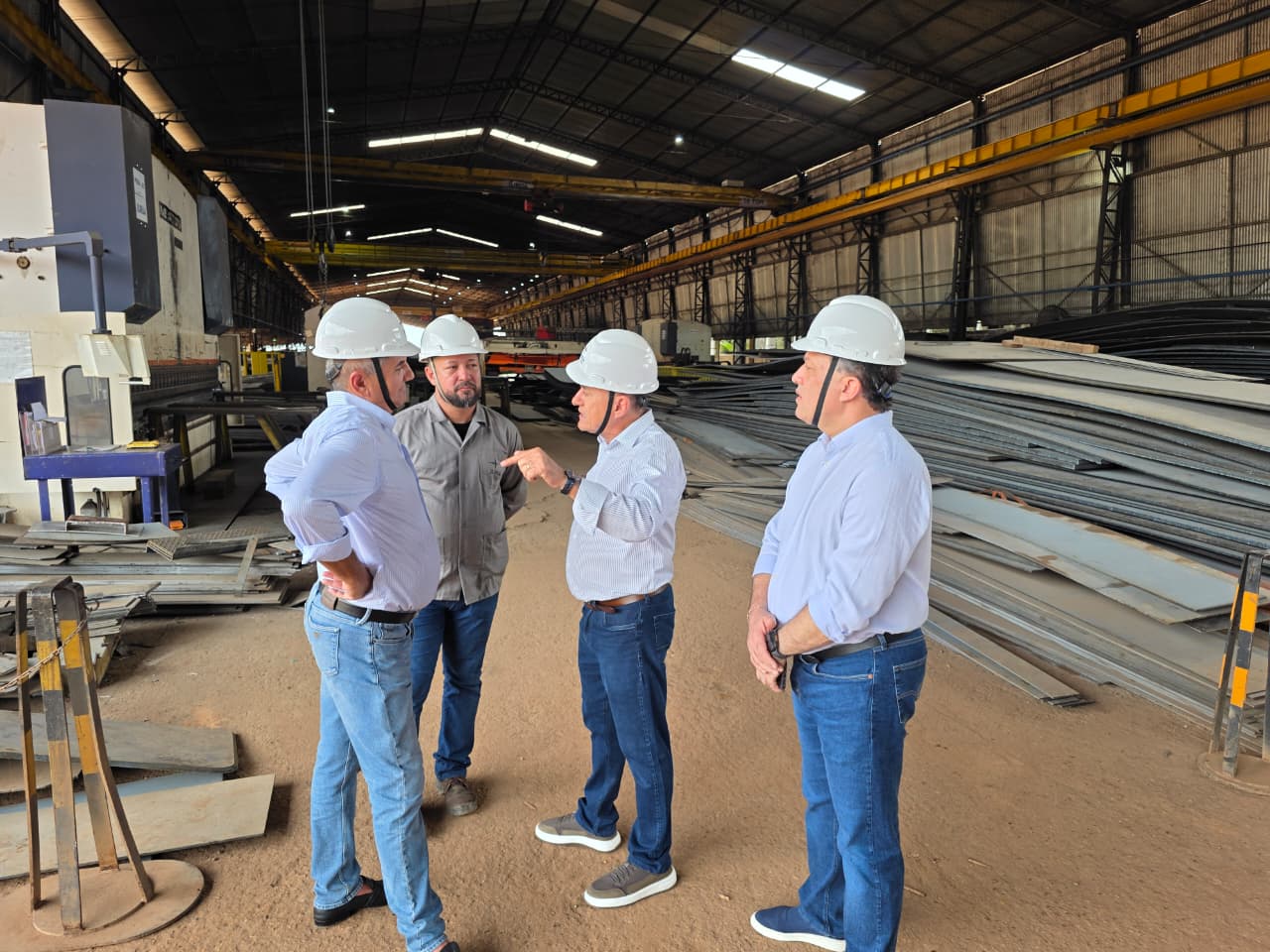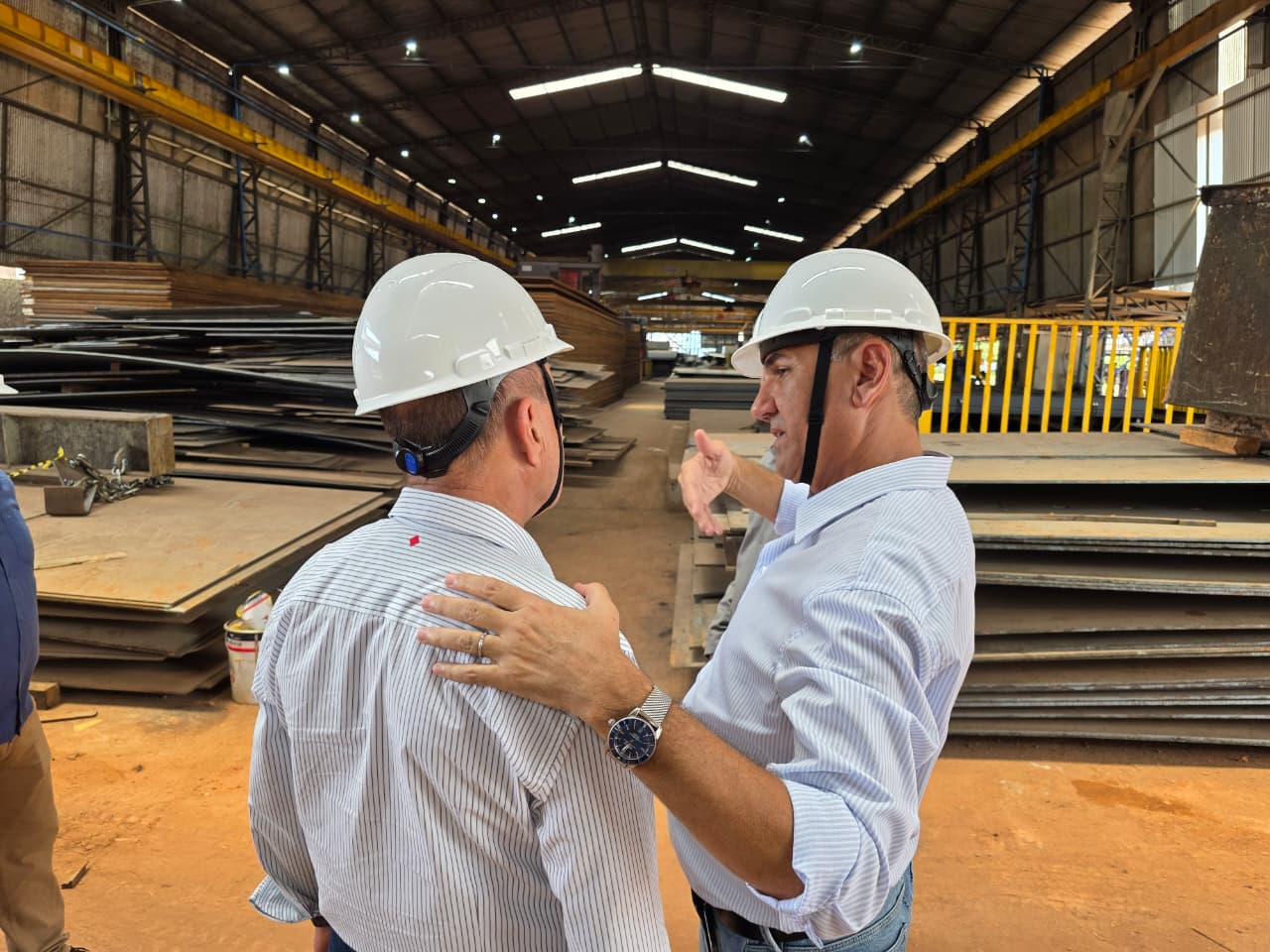 Recebido pelo empresário Marmude Camely, o prefeito percorreu as instalações do estaleiro e conheceu de perto o processo de produção de balsas graneleiras e embarcações utilizadas no transporte fluvial de cargas, especialmente grãos como soja e milho.