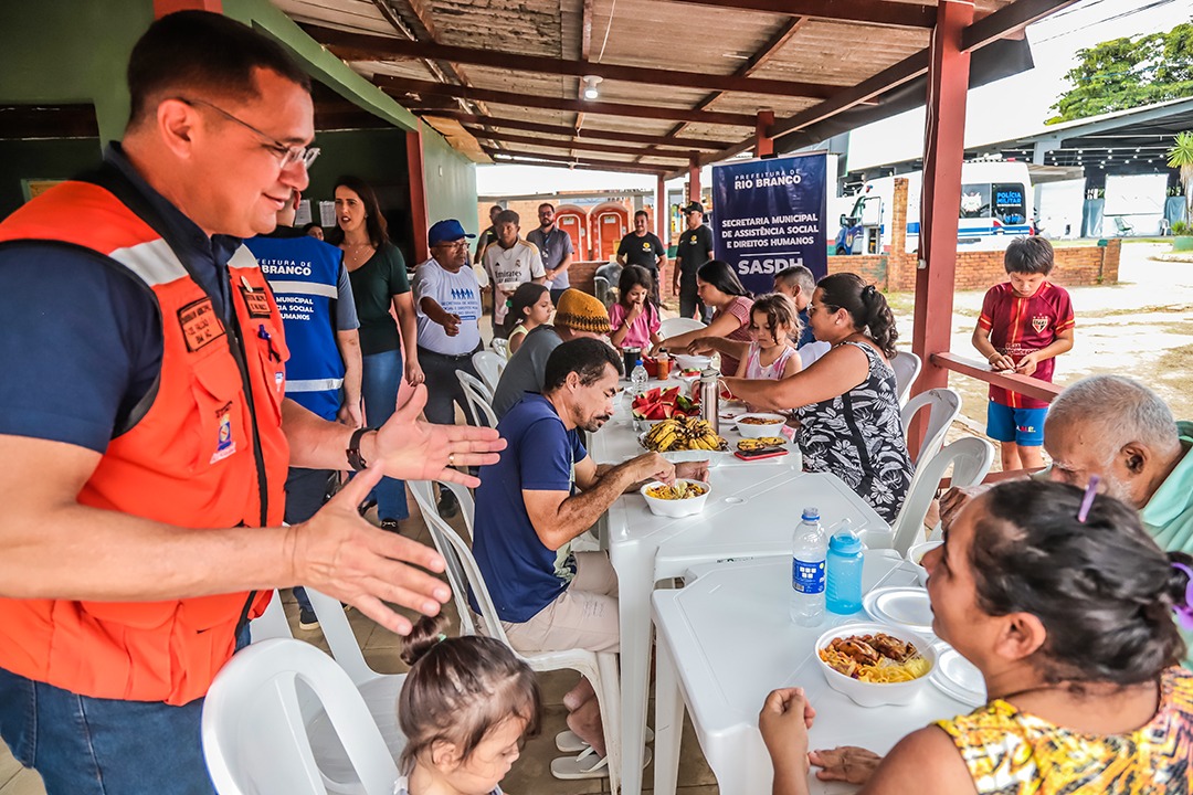 Gestor de Rio Branco esteve no Parque de Exposições, conversou com moradores, almoçou com as famílias acolhidas e recebeu informações técnicas da Defesa Civil sobre o nível do rio