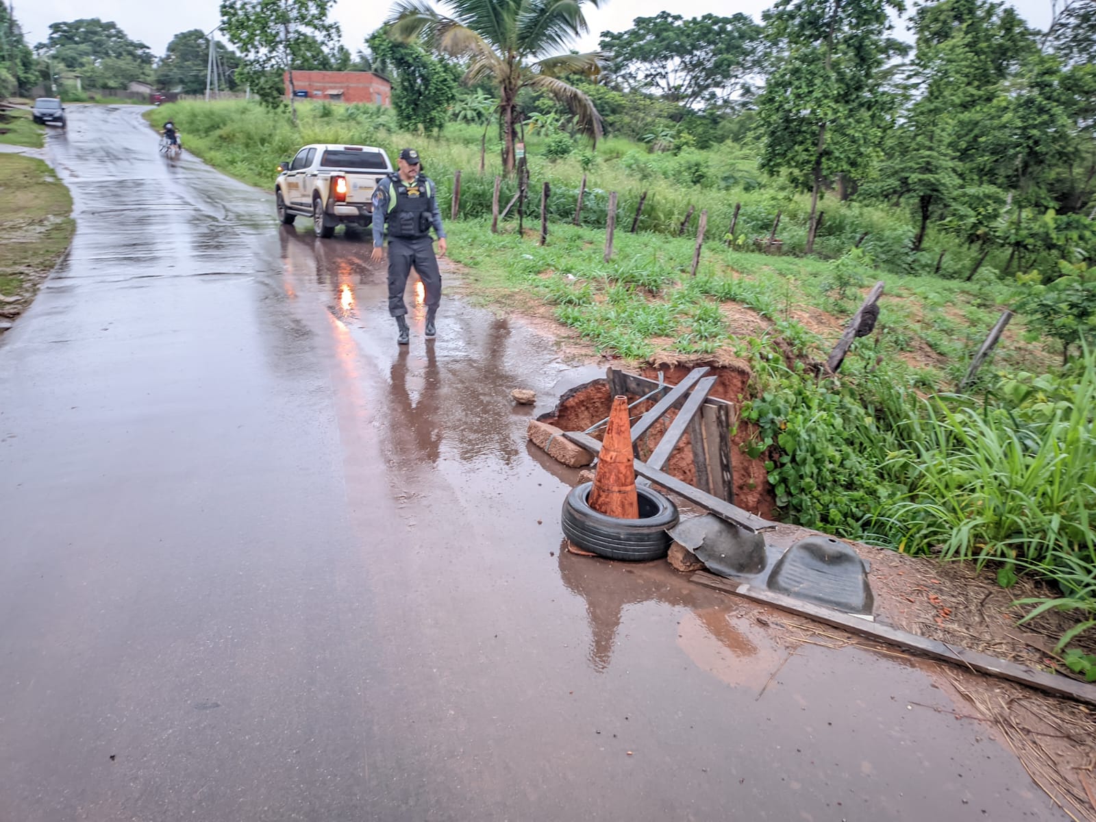 O incidente ocorreu devido às fortes chuvas que atingem a capital, provocando o sedimento da pavimentação em uma curva acentuada. O deslocamento de terra formou uma cratera profunda à margem da pista, representando risco elevado para motoristas e motociclistas que trafegam pela região.