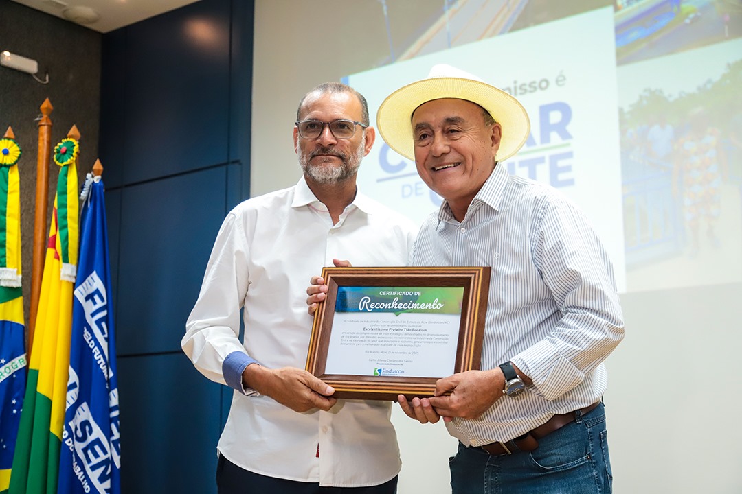 Durante o evento, o prefeito recebeu do Sindicato da Construção Civil do Acre um certificado de reconhecimento pelo compromisso e pela visão estratégica no desenvolvimento de Rio Branco. A homenagem reforça os expressivos investimentos realizados pela gestão na indústria da construção civil, setor que impulsiona a economia, gera empregos e contribui diretamente para a melhoria da qualidade de vida da população.