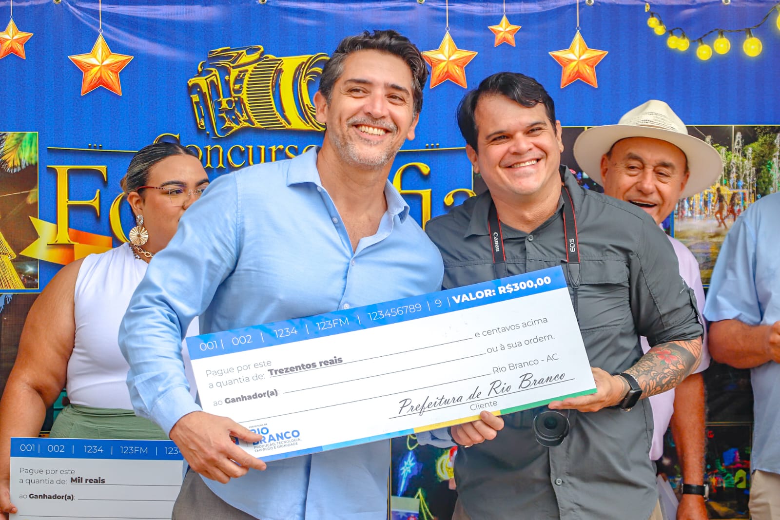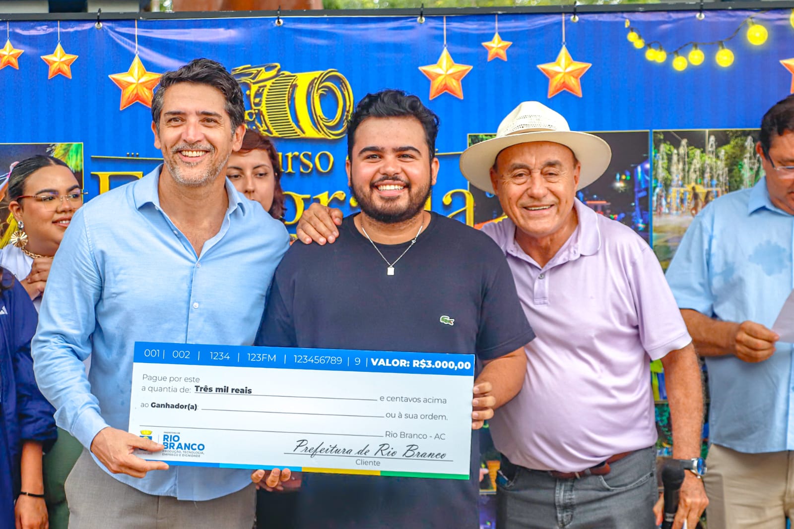 Foto do fotográfo Samuel recebendo seu prêmio das mãos do prefeito de Rio Branco e do secretário de Comunicação Ailton Oliveira