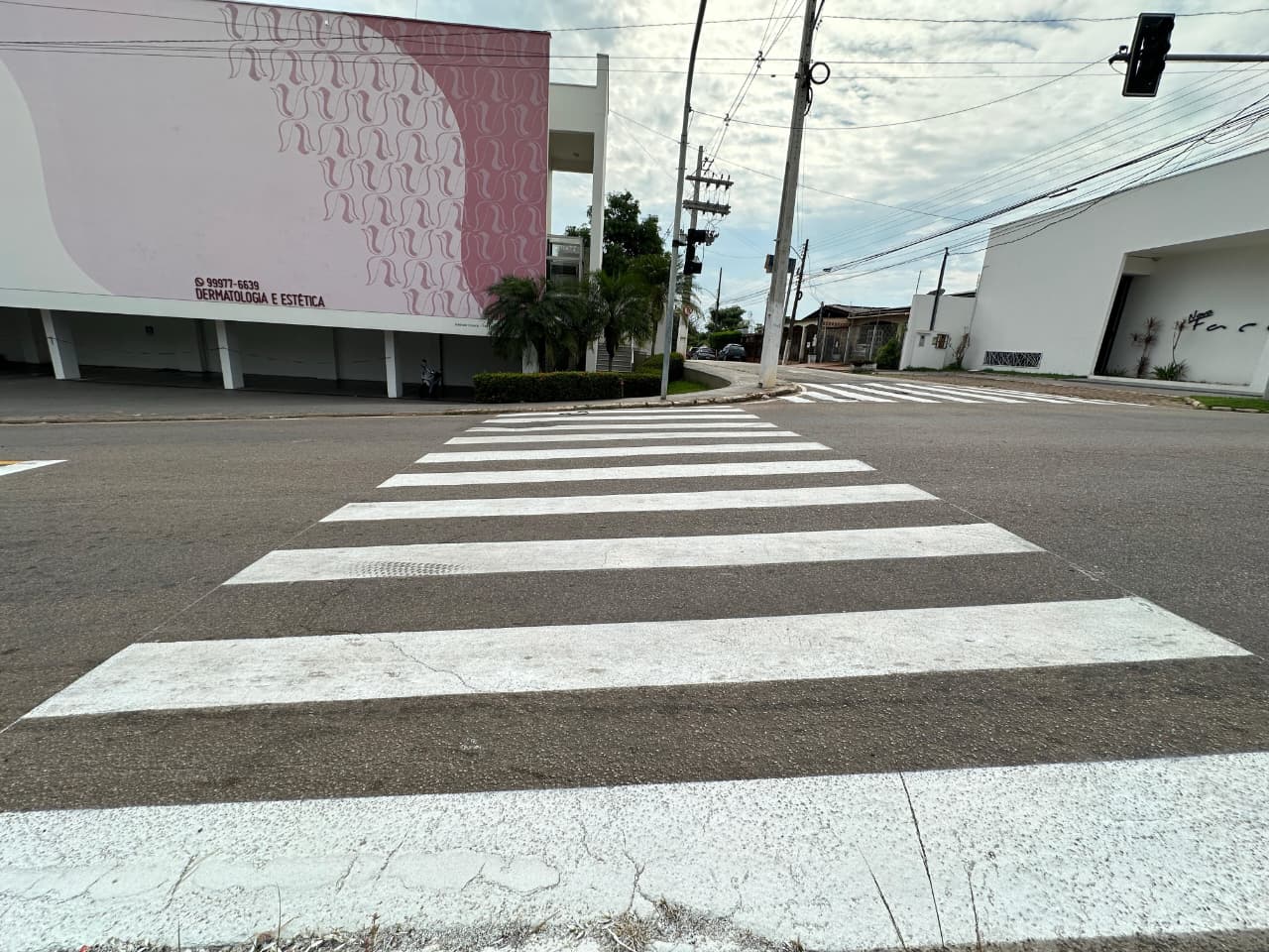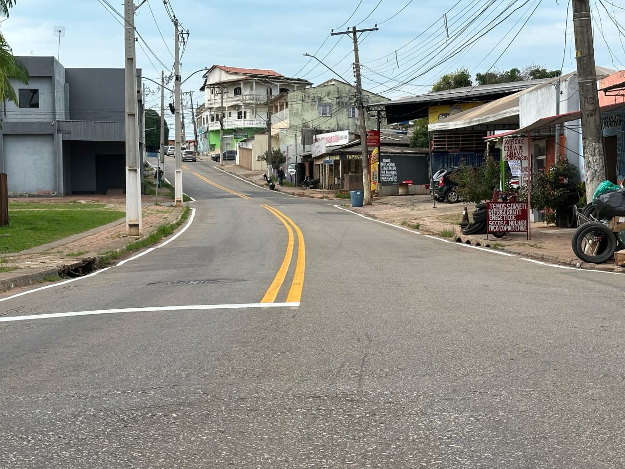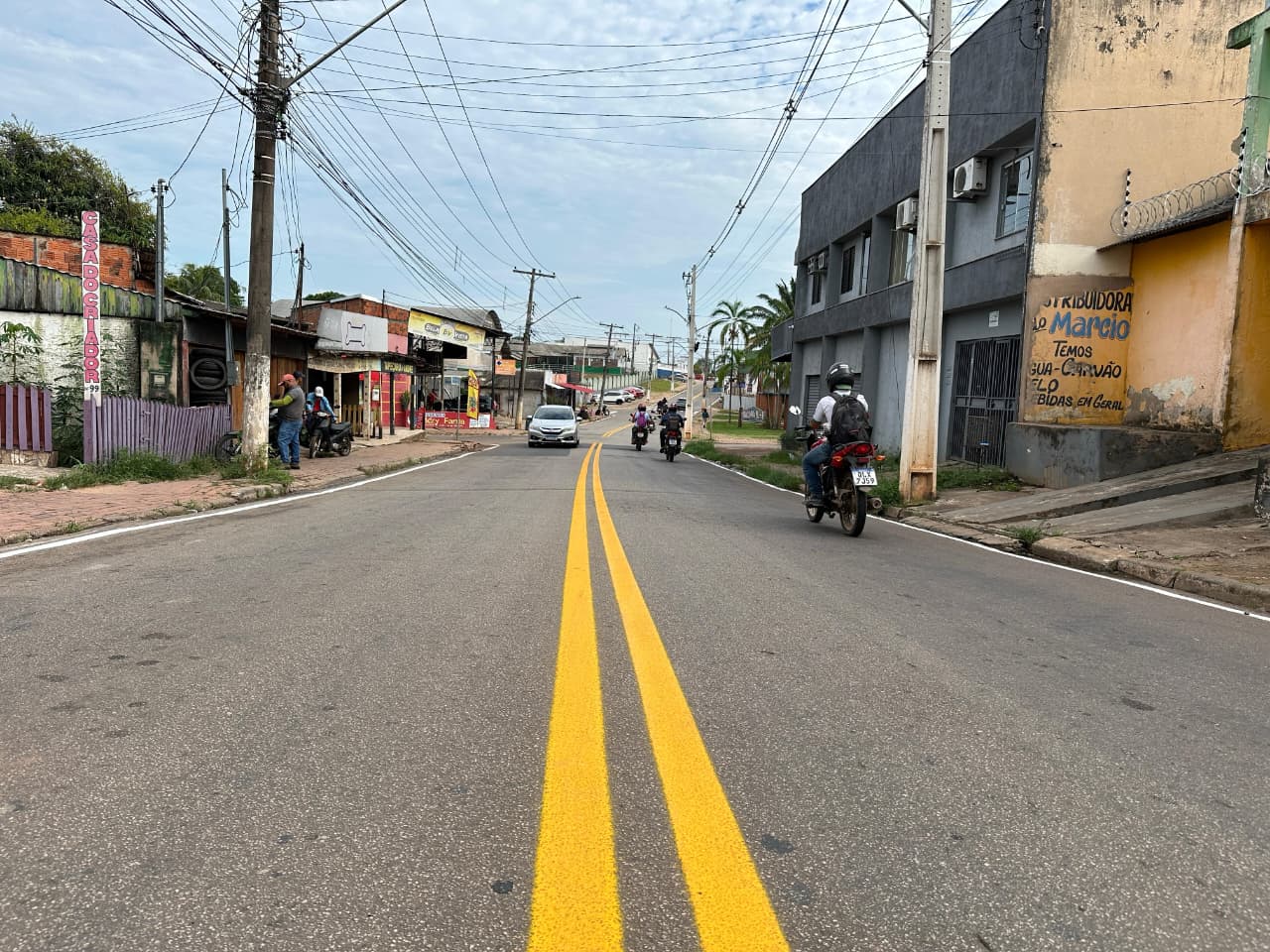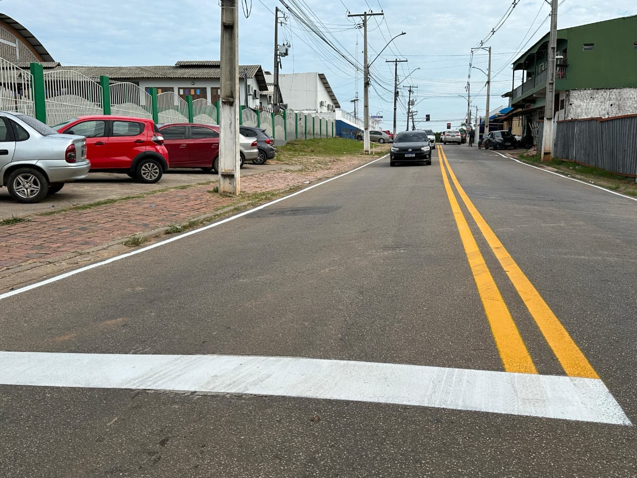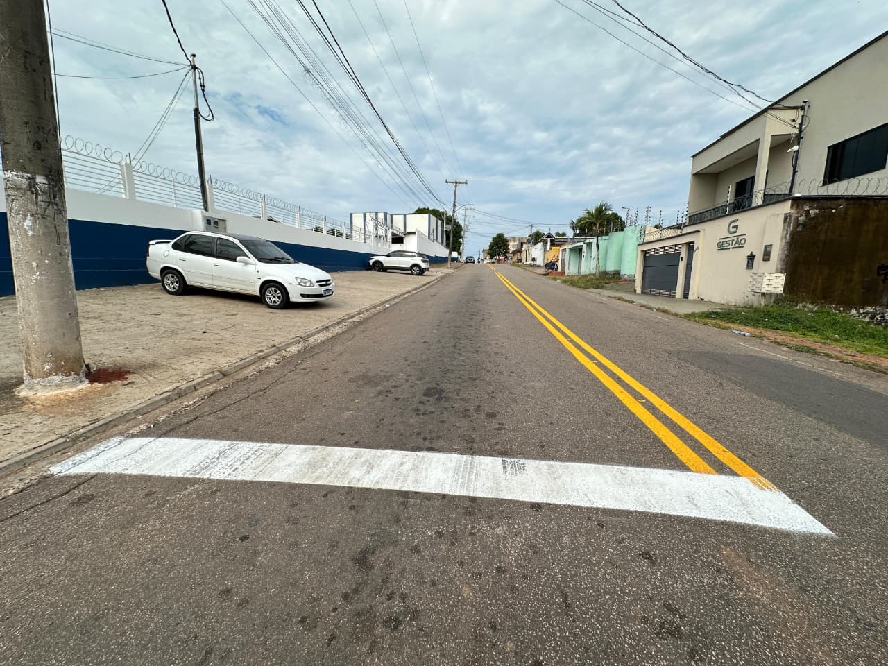 A rua Omar Sabino, uma via de grande circulação, ganhou nova demarcação de faixas, linhas de bordo, setas direcionais, marcações de retenção e travessias para pedestres, proporcionando organização, previsibilidade e proteção durante a condução de veículos, motocicletas, bicicletas e no deslocamento de pedestres.
