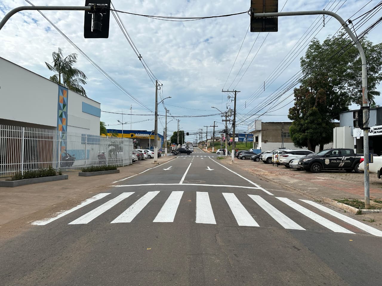 A rua Omar Sabino, setas direcionais, marcações de retenção e travessias para pedestres. (Foto: Secom)