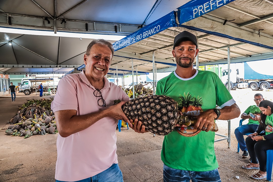 “Essa feira vem em boa hora, porque temos muita fruta e a prefeitura fez um acordo com os produtores para trazer aqui e tentar vender, para a gente não perder. Graças a Deus está dando certo, o que trouxemos estamos vendendo. É o nosso abacaxi gigante, o abacaxi de Tarauacá — a terra do abacaxi grande e da mulher bonita”, celebrou Rodrigues.