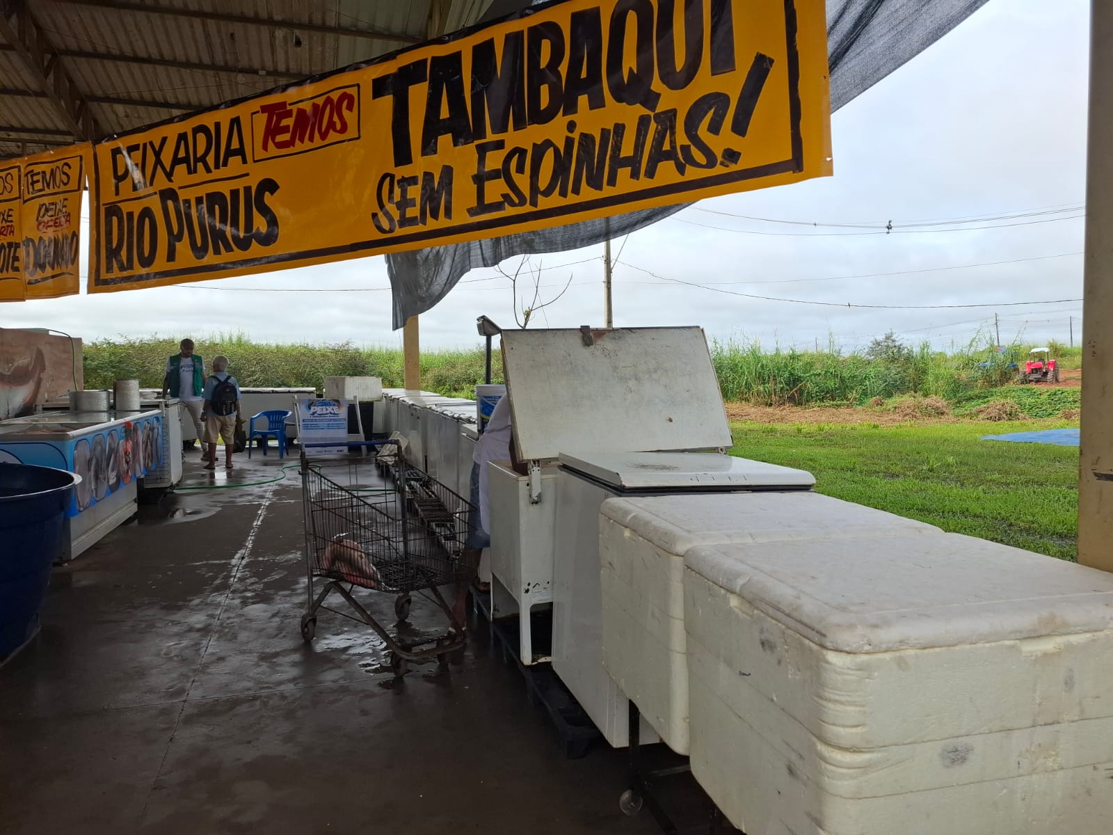 Ele também explicou como funciona o manejo dos peixes: “O objetivo é apresentar nosso pescado e mostrar todo o processo de criação. O transporte é feito em caixas com oxigênio para espécies como tambaqui e pintado. Já o pirarucu não precisa, pois respira na superfície. Hoje, nosso principal foco é o pirarucu, desde a fase de alevinos até o abate”, explicou.