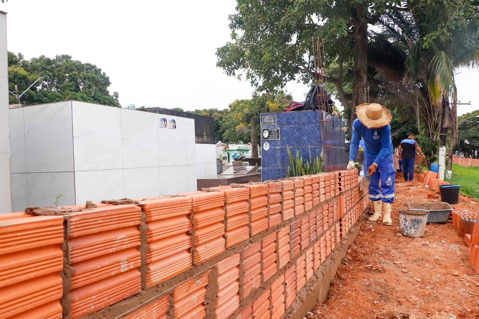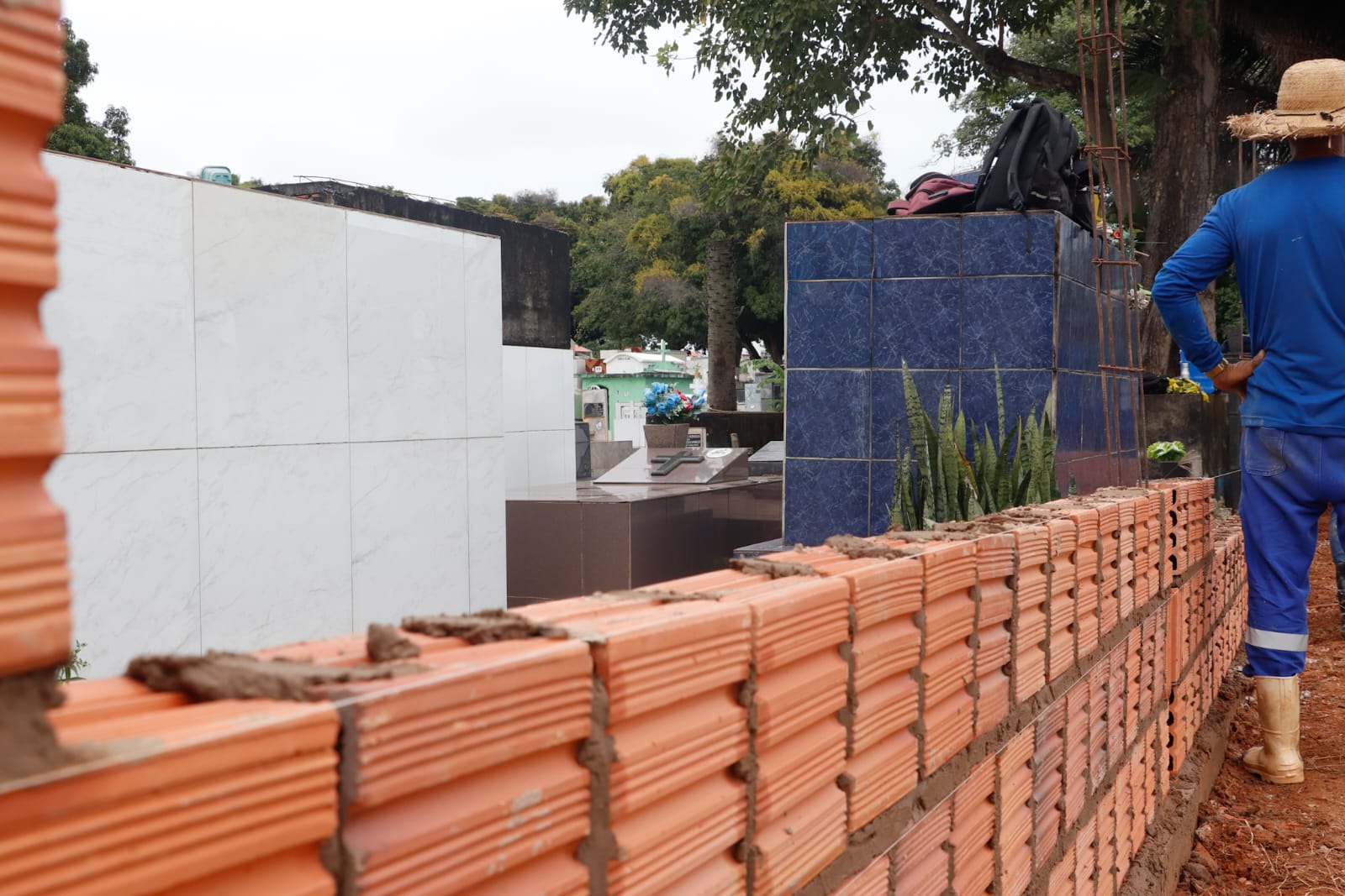 Intervenção da Prefeitura no cemitério São João Batista contempla mais de 250 metros de estrutura em alvenaria, incluindo tijolos, massa cimentícia e concreto armado