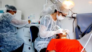 Vans odontológicas da prefeitura realizam atendimento para abrigados no Parque de Exposição 14 de março de 2024